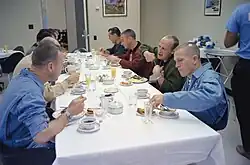 For the Apollo 11 Moon landing mission in July 1969, Borman was assigned as NASA liaison to President Richard Nixon at the White House. He viewed the launch from the President's office.[104] Nixon initially had prepared a long speech to read to the astronauts on the Moon during a phone call, but Borman persuaded him to keep his words brief and non-partisan. He also convinced the President to omit the playing of the "Star Spangled Banner", which would have required the astronauts to waste two and a half minutes of their time on the surface standing still.[105] He accompanied the President in Marine One, when it flew to the recovery ship, the aircraft carrier USS Hornet to meet the crew of Apollo 11 on their return.[106]