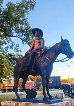 Frank "Pistol Pete" Eaton Bronze by Harold T Holden on the campus of Oklahoma State University unveiled September 2024. The bronze is 9-foot statue of Frank Eaton on horseback and sits on a stone base.[8]
