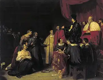 After the death of Lawrence he exhibited again at the Academy in 1842. He sent The Adoration of the Magi, Suffer little Children to come unto Me, and The Rescue of Cymbeline. He contributed in the same year to the British Institution 'Spenser's Faerie Queene, containing Portraits of Queen Elizabeth and her Court.' In 1843 he sent three cartoons to Westminster Hall in competition for the prizes offered in connection with the rebuilding of the Houses of Parliament, and for one, 'Una coming to seek the assistance of Gloriana,' an allegory of the reformed religion seeking the aid of England, suggested by Spenser's Faerie Queene, he was awarded one of the extra prizes of 100 pounds.[1]