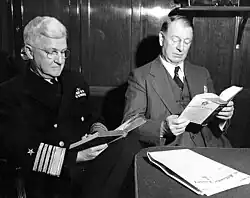 When a new naval officer on Knox's staff told him, "I'm no New Dealer," Knox replied, "I fought the President with every resource at my command. But now I've squared my politics with my conscience and I'm proud to serve under such a great man. At that," Knox added, "it's a good thing to have a couple of fellows around here who aren't New Dealers!"[9] He traveled extensively to Navy installations worldwide. Knox also supported the continued racial segregation in the United States Armed Forces.[10]