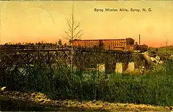 In 1911 and 1912 Mebane created the North Carolina and Virginia Railroad.[2] With the railroad having expended much of his financial resources, his main creditor, the Marshall Field Corporation of Chicago, assumed control of all but two of Mebane's mills. Control of them would later pass to Fieldcrest.[1][3] Mebane also retained, through his Spray Water Power and Land Company and Rockingham Company, possession of 8,000 acres of farmland—known as "the Meadows"—between near the confluence of the Smith and Dan Rivers and the town of Draper. There, he developed a successful cattle business and established a hunting lodge.[4]