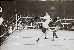 While Moran was serving in the U.S. Navy in 1908, he knocked out fighter Fred Cooley in the second round. While serving on the U.S.S. Mayflower, he served as a spar partner for President Theodore Roosevelt. He began his career as a prize-fighter that same year with a match against Fred Broad. Soon, Moran, who had a hard right hand punch which he called "Mary Ann", became known as the "White Hope" of the teens. In 1914 he fought Jack Johnson for the Heavyweight Championship of the World, and in 1916 "The Fighting Dentist" went up against Jess Willard for the same title, but lost both bouts. He lost his last fight to Marcel Nilles for the Heavyweight Championship of France on December 22, 1922. He retired from boxing after 66 bouts with a record of 36 wins (28 by a knockout), 13 losses, 16 draws and 1 no contest.[3]