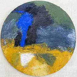 Okada was drafted in the United States Army for just under two years, including several months at an evacuation hospital in South Korea during the Korean War near the Pusan area. He was a medic. After serving in the army, he attended the Cranbrook Academy of Art in Michigan, receiving a Bachelor of Fine Arts degree in 1957.[3] While at Cranbrook he began visiting New York City, where he met many of the leading lights of Abstract Expressionism, whose inspiration began to show in his own work. After winning a Whitney Fellowship in 1957 he spent about a year in New York, studying and exhibiting. Evenings were often spent at the Cedar Tavern, interacting with the members of the city's burgeoning modern art scene. Okada's work received considerable attention. He was associated with the Brata Gallery, where he showed regularly, and was profiled in a 'new talent' issue of Art in America magazine. However, he found it difficult to develop his style amid the excitement of New York, and was disappointed by how quickly commercial interests and new hierarchies took root as the city became the world's new focus of modern art. In 1958 he returned to Seattle.[1]