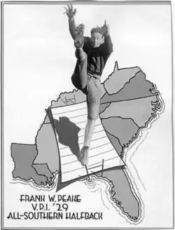 Frank W. Peake (May 15, 1903 – January 15, 1978)[1] was a college football running back for the Virginia Tech Hokies of Virginia Polytechnic Institute.[2] Peake's College Football Hall of Fame coach Andy Gustafson, said he never saw his equal as a punt returner.[3] Peake was voted into the Virginia Sports Hall of Fame in 1978,[4] and the Virginia Tech Sports Hall of Fame in 1983, the second year Tech athletes were honored. [5] He was also an accomplished track star.