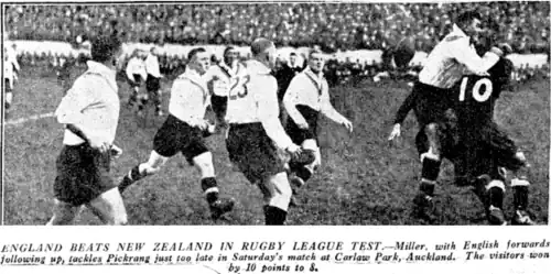 After the Auckland match with England, Pickrang returned to the Manukau side to play against Mount Albert on August 1. He scored a try and played “a great all-round game” in an 11-9 win.[48] The Herald again wrote a piece on Pickrang's play saying “an outstanding feature of the match was the great all-round game played by Pickrang in the Manukau vanguard. He was always in the picture on attack or defence and his tackling was excellent”.[49] He was then named by selectors Thomas McClymont, Jim Amos, and Bert Avery to make his New Zealand debut against England at the age of just 21 which was very rare for a forward to be so youthful. He was picked to play in the second row with Billy Glynn. The Auckland Star said that “Pickrang is the best forward in Auckland”.[50]