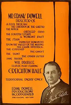 Frank Powell was born in 1877 in Hamilton, Canada, the child of Elizabeth and Francis Powell.[1][5] According to the 1920 edition of the Motion Picture Studio Directory and Trade Journal, he received part of his education in Cleveland, Ohio, although that publication provides no other information about his schooling or reveals whether his interest in theatre began in that city.[8] However, a 1916 notice in the trade paper Variety does confirm Powell's close and early connection to Cleveland. In an April 26 news item titled "Frank Powell Resting", the widely read publication announces that the 38-year-old director was traveling to Cleveland, "his boyhood home", for a vacation.[9] What is known about Powell's 12-year stage career is that he worked with playwright Kirke La Shelle and performed in at least two major Broadway productions. In 1904 he performed in the play Tit for Tat at the Savoy Theatre, and the next year he both acted in and served as a director for Augustus Thomas's comedy The Education of Mr. Pipp.[8][10][11] He then relocated for several years to England, where he directed productions for actress Ellen Terry before returning to North America.[8][12] In its October 15, 1915 issue, the Austin Statesman and Tribune provides details about the course of Powell's initial stagework with Terry, background that he shared with the newspaper in an interview: