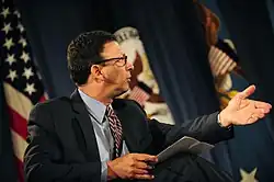 ![]() Sesno moderating a televised conversation between Secretary of State Hillary Clinton and Defense Secretary Leon E. Panetta; 2011. | |