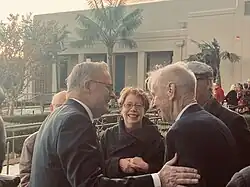![]() Frank Stilwell (on the right of picture) being greeted by Australian Prime Minister, Anthony Albanese (left of picture), who was one of his former students in Political Economy at the University of Sydney. (In the centre of the picture, smiling, is Dr Patricia Ranald, a Research Associate in the Political Economy department). | |