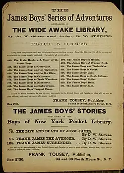 In 1881, the first Jesse James dime novel story appeared in Tousey's five-cent Wide Awake Library: "The Train Robbers; or, A Story of the James Boys'.[5] While this factual-made-fictional bandit was already famous in other literature, it would be some years yet for dime novels to fully market on him.[11] Not only first on the scene, Tousey also became a major source of output for the James tales in dime novels. He even created a series called James Boys Weekly, and his works exhibited both the fictional character and real life events.[5]