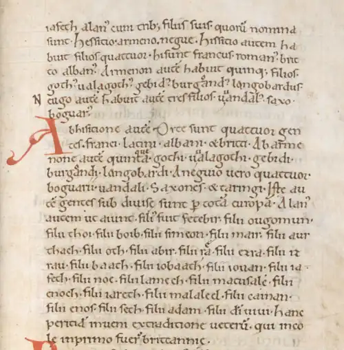 The Historia is the only work prior to the 19th century to make actual use of the Table. A widely copied text, it ensured the Table a wide diffusion.[27] There are three Gaelic versions of the Table derived from the Harleian Historia: in the Lebor Bretnach, a mid-11th-century translation of the Historia; in one recension of the late 11th-century historical compilation Lebor Gabála Érenn; and in the 11th-century Middle Irish Sex aetates mundi.[37][38] In the 12th century, Lambert of Saint-Omer incorporated the text of the Table from a copy of the Historia into his encyclopaedic Liber Floridus.[39] Another 12th-century writer, Geoffrey of Monmouth, was also influenced by the genealogical material in the Historia, including the Frankish Table.[40]
