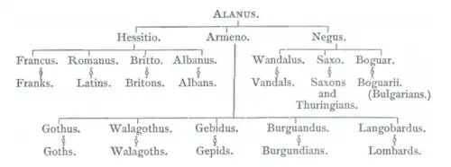 The Frankish Table of Nations is a brief early medieval genealogical text in Latin giving the supposed relationship between thirteen nations descended from three brothers. The nations are the Ostrogoths, Visigoths, Vandals, Gepids, Saxons, Burgundians, Thuringians, Lombards, Bavarians, Romans, Bretons, Franks and Alamanni.