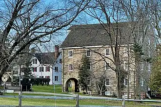 In 1768, Samuel Lewis built a wooden grain mill here on the Passaic River. During the American Revolutionary War, it provided grain to the Continental Army during the 1779–1780 winter encampment at nearby Jockey Hollow. In 1842, Ferdinand Van Dorn bought the property and built a new, three and one-half story stone mill, now known as Van Dorn's Mill.[3][4] In 1929, local resident and prominent restaurateur William Childs bought the mill property and moved the barn to the other side of U.S. 202. He restored it and established an inn, now known as the Grain House Restaurant at the Olde Mill Inn. In the 1970s, the Olde Mill Inn hotel, venue and meeting center was built on the property next to the restaurant.[5]