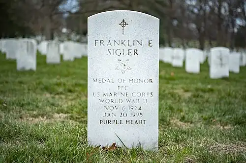 Private First Class Franklin Earl Sigler (November 6, 1924 – January 20, 1995) was an American Marine who received the Medal of Honor for his actions in the Iwo Jima campaign – a one-man assault on a Japanese gun position which had been holding up the advance of his company for several days, and for annihilating the enemy gun crew with hand grenades. Although painfully wounded during his attack, he directed the fire of his squad and personally carried three of his buddies who were wounded to safety behind the lines.