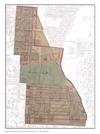 The contemporary boundaries of Franklin Park have been disputed since the early 2000s and vary depending on the source. The general consensus would include the boundaries of Broad Street to the north, Main Street to the south, and Alum Creek to the east.[9][10] The neighborhood's boundary to the west tends to be disputed with Olde Towne East. While some sources claim the boundary between the two neighborhoods to be Wilson Ave,[11] other sources claim Olde Towne East follows a staggered boundary past Wilson Ave.[12]