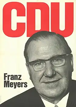 Franz Josef Heinrich Georg Meyers (31 July 1908 – 27 January 2002) was a German politician who served as the 4th Minister President of North Rhine-Westphalia from 21 July 1958 to 8 December 1966. A member of the Christian Democratic Union (CDU), he had previously served as mayor of Mönchengladbach in 1952 and as Minister of the Interior of North Rhine-Westphalia from 1952 to 1956.[1]