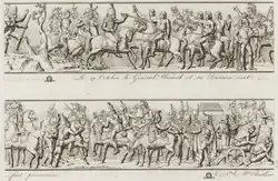Michel Ney's VI Corps smashed Riesch on 14 October in the Battle of Elchingen and forced the survivors to retreat to Ulm.[22] Murat set out in pursuit of Werneck. On 16 October, there was a clash between Ney's cavalry and Prince Friedrich Franz Xaver of Hohenzollern-Hechingen's division at Langenau. Murat caught a 5,000-man brigade under Rudolf Sinzendorf at Herbrechtingen on 17 October and wiped out half of it.[23] On the same day, Ferdinand's cavalry fought off the French cavalry at Nördlingen,[24] and there was another clash with Werneck's troops at Neresheim. Murat and Ney with 28,000 troops cornered their adversary on 19 October at the hamlet of Trochtelfingen.[note 3] On that day Werneck capitulated with 15,000 troops, 28 guns, 12 colors, two standards, and four generals. Murat demanded that the terms include nearby Austrian units and Werneck complied. Because of this the artillery reserve also surrendered. Hohenzollern refused to join in the capitulation and got away with 10 squadrons of cavalry. Ferdinand also managed to escape to Bohemia with Karl Philipp, Prince of Schwarzenberg and 12 squadrons of horsemen.[25] On 20 October Mack surrendered in the Battle of Ulm[26] with 20,000 infantry, over 3,000 cavalry, and 59 guns.[23]