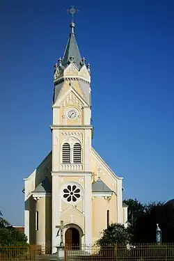 The church, located at the intersection of Ana Ipătescu, Victor Hugo and Chișodei streets, is also known as Fratelia A, because there is also a small Roman Catholic church called Fratelia B on Ivan Pavlov Street.[4] It is built in neo-Gothic style according to the plans of the architect Elemér Makai. The church has a length of 43 m and a width of 13 m. The height of the tower is 34 m. The bells were cast in 1930 by the Novotny company from Timișoara. The main altar is adorned with a wooden statue of Saint Joseph, the patron saint of the church. The windows are arched in Romanesque style, made of white and yellow glass, the colors of the Holy See.