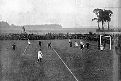 Frank Brettell was the club's first team manager.[21] The club was elected directly into the First Division of the Southern League in 1899, with their first league match being played away at Chatham Town on 2 September 1899 (a 1–0 victory),[22] followed three days later by the first match at Fratton Park.