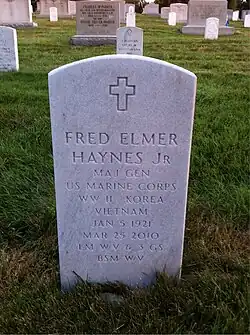Fred Elmore Haynes Jr. (January 5, 1921 – March 25, 2010) was a United States Marine Corps major general who served in World War II and the Vietnam War. He completed his Marine Corps career as deputy chief of staff for Research, Development and Studies at Headquarters Marine Corps. He was the older brother of actor and Dallas television personality, Jerry Haynes aka Mr. Peppermint,[1][2] and uncle of musician and artist Gibby Haynes.