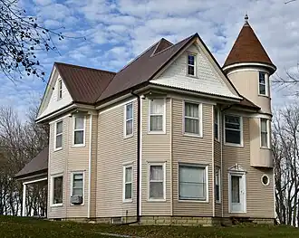 The Fred G. Turner House, also known as Valley View Farm, is a historic building located in rural Iowa County, Iowa near the town of North English. Turner moved to this area with his family in 1866. He married in 1893 and inherited the family farm. By 1899 the farm included 500 acres (200 ha).[2] In addition to farming, Turner was involved in politics, serving on the local school board, two terms in the Iowa House of Representatives, and as a county supervisor. The farm remained in the family until 1959. Although a free classic Queen Anne house is unusual in rural Iowa, this house is one of four in the immediate area.[2] It was designed and built by local contractor Leslie Roller. The house features a pyramid hipped roof, lower cross gables, an irregular plan, corner turret, contrasting use of wood shingles on the gable and turret, and an asymmetrical porch. It was listed on the National Register of Historic Places in 1985.[1]