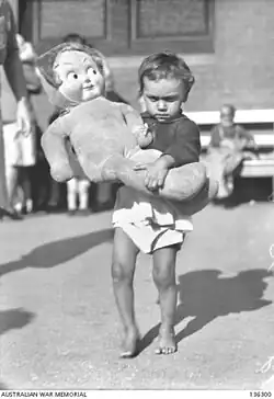 Following the bombing of Darwin in February 1942, there were military orders to evacuate The Bungalow, so Topsy went to find work on a farm in New South Wales with her girls. However bad circumstances there caused her to leave, and she was taken in by a couple in the Sydney suburb of Vaucluse as a domestic. Freda stayed with her, while the Church Missionary Society helped to place Rona at an Anglican home at Mulgoa, west of Sydney, where Freda later joined her.[8] In late May 1942 a number of other children from The Bungalow were escorted to Mulgoa via Adelaide[8] (and possibly Melbourne as well).[9][c]