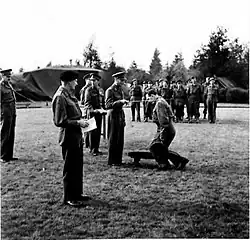 For his role in Operation Overlord, de Guingand was further promoted in the Order of the British Empire when he was created a Knight Commander of the Order of the British Empire on 29 June 1944.[112] This was an unusual (although not unprecedented) honour for a temporary major-general, particularly one who still held the substantive rank of major.[113][114] He was invested with his knighthood in the field by King George VI at Eindhoven on 15 October, along with Lieutenant-Generals Miles Dempsey and John Crocker.[114] De Guingand's substantive rank was advanced to colonel on 1 December.[115]