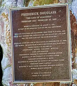 In the 21st century, historical plaques were installed on buildings in Cork and Waterford, Ireland, and London to celebrate Douglass's visit: the first is on the Imperial Hotel in Cork and was unveiled on August 31, 2012; the second is on the façade of Waterford City Hall, unveiled on October 7, 2013. It commemorates his speech there on October 9, 1845.[94] The third plaque adorns Nell Gwynn House, South Kensington in London, at the site of an earlier house where Douglass stayed with the British abolitionist George Thompson.[95] On July 31, 2023, the first statue of him in Europe was unveiled in High Street in Belfast.[96]