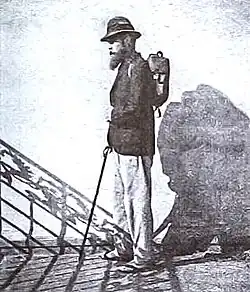 "Burly" in his favorite attire, including sandals, a walking stick, and backpack, 1915