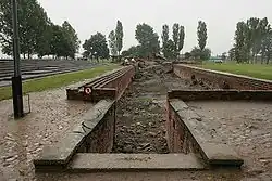 On 24 August 1943, a single transport of 1,200 children from the Białystok Ghetto arrived at Theresienstadt.[35] These children were frightened of the showers because they believed that they were gas chambers. The Białystok children were housed in the western barracks, separated from the rest of the camp by a barbed-wire fence. Czech gendarmes guarded the perimeter and kept the children strictly segregated from the rest of the camp under threat of severe punishment.[36][37] According to Kämper, Hirsch wanted to confirm the rumors that Jews deported from Theresienstadt were murdered in gas chambers. In any event, he managed to jump over the wire fence separating the Białystok children from the rest of the Theresienstadt prisoners, but he was caught and arrested by a Czech guard. Peter Erben believes that Hirsch could have avoided punishment if he had been able to speak Czech. Instead, he was brought to the commandant's office and beaten.[38] Allegedly for this violation, he was deported to Auschwitz on 8 September.[14][19]