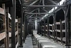 Using his influence with the Germans, Hirsch obtained better food for the children and food parcels addressed to prisoners who had died.[19][51] The soup for the children was thicker than for other prisoners; allegedly it was from the Gypsy camp and contained semolina.[52] The children's barracks also received additional coal and were slightly better heated.[53] Hirsch also convinced the Germans to hold roll call inside the barracks, so the children were spared the hours-long ordeal of standing outside in all weather.[54] After another transport arrived in December 1943, there were about 700 children in the family camp;[49] Mautner was also on this transport.[9][h] Zuzana Růžičková, who had also arrived in December, entered into the children's barracks without authorization in order to obtain work as a carer, but was caught by an SS man. To distract him, Hirsch reportedly said "Herr Oberscharführer, who have you killed and looted today?"[i] Instead of beating Hirsch, the SS man offered him a cigarette, which Hirsch declined.[55] Nevertheless, Hirsch was not excepted from the brutal treatment of the guards, being badly beaten when a boy slept through the roll call.[56]