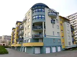 Most of Freedom Hill consists of a housing estate of multi-family blocks built in the 1980s, though the accompanying infrastructure is underdeveloped. The area is dominated by multi-family buildings, with a significant presence of twelve-story blocks.[5] Among Bydgoszcz’s districts, Freedom Hill stands out for its substantial proportion of high-rise buildings. Along several streets, there is single-family housing, some of which dates back to the Prussian partition and the interwar period.[5]