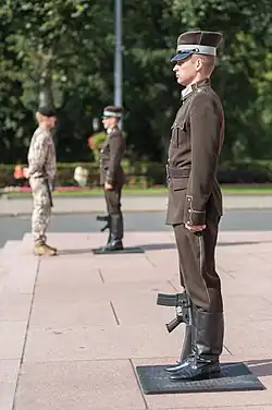 The guard of honour was present from the unveiling of the monument until 1940, when it was removed shortly after the occupation of Latvia.[1] It was renewed on 11 November 1992.[1] The guards are soldiers of The Guard of Honour Company of the Staff Battalion of the National Armed Forces (Latvian: Nacionālo Bruņoto spēku Štāba bataljona Goda sardzes rota).[21] The guard is not required to be on duty in bad weather conditions and if the temperatures are below −10 °C (14 °F) or above 25 °C (77 °F).[22][23] The guards work in two weekly shifts, with three or four pairs of guards taking over from each other hourly in a ceremony commanded by the chief of the guard.[22][23] Besides them there also are two watchmen in each shift, who look out for the safety of the guards of honour.[23]