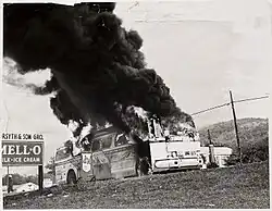 The second site incorporated into the national monument is that of the bus burning, located outside of Anniston along Old Birmingham Highway/State Route 202 some 6 miles (9.7 km) away from the Greyhound station. It was at this spot that the bus broke down because of its flat tires. The segregationist mob, which had followed it from the bus depot, continued its assault, throwing "a bundle of flaming rags into the bus that exploded seconds later" which set the vehicle ablaze.[5] The mob attacked the passengers as they tried to flee.[6] Freelance photographer Joseph "Little Joe" Postiglione photographed the bus as it burned; the resulting image has become an icon of the civil rights movement.[5][12] An Alabama Historical Marker, erected in 2007 under the auspices of the Theta Tau chapter of Omega Psi Phi fraternity, marks the site of the bus burning.[5][13]