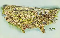 Under Wood's leadership, Freedomland's designers created a history-themed concept, divided into seven themed areas based on the history of the United States. Each section featured attractions, shops, and restaurants fitting that section's theme. The layout resembled a large map of the contiguous United States and was designed like a movie set. As guests entered from the parking lot, they walked into Little Old New York of the 1890s. Baychester Avenue and the New England Thruway at the park's western edge approximately represented Freedomland's border with Canada.[20][62] The designers added decor such as vintage building advertisements and a night-lighting system.[63] Freedomland's attractions on opening day were significantly different from what had originally been planned. Of the 16 areas and attractions announced in an August 1959 press release, 12 were operating on opening day, some of which were themed to a completely different time span than in the original plan.[64] As conceived, the park also focused on history from a narrow era, between roughly 1850 and 1900, rather than a larger period.[65]
