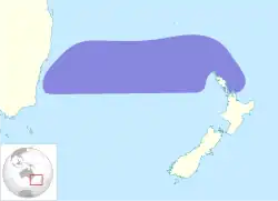 The tagged birds were initially only tracked at sea; efforts to find the birds' breeding location were unsuccessful until 2013, when a breeding site on Little Barrier Island was found.[9] A team of researchers from Auckland University led by Chris Gaskin and Matt Rayner discovered the breeding site in the Hauraki Gulf Marine Park in February 2013. Researchers will continue observing the birds from a distance to prevent disturbing the breeding cycle. They hope to establish the distribution and population of the remaining New Zealand storm petrels.[10] In February 2014, an egg of the New Zealand storm petrel on Little Barrier Island was first discovered. It measured 31 mm by 23 mm and was coloured white with a fine dusting of pink spots concentrated at one end.[11]
