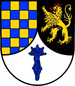The Frei-Laubersheim fibula appears as a charge in Frei-Laubersheim's municipal coat of arms. It occupies the field in base(the lower section) on an escutcheon that is tierced in mantle (divided into three in a somewhat "coatlike" pattern).