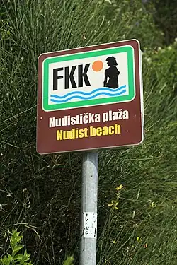 Freikörperkultur (FKK), meaning 'free body culture', is a social and health culture that originated in the German Empire, with its beginnings historically rooted in the Lebensreform social movement of the late 19th century.[1][2][3] It promotes the health benefits of nudity—such as exposure to light, air, and sun—alongside a broader aim to reform life and society.[1] Freikörperkultur shares cultural and philosophical ties with naturism and nudism, which involve communal nudity among individuals and families during leisure time, sports, and everyday life.[1]