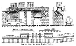 The route’s terrain-adapted design avoided viaducts and tunnels. Several small sandstone culverts, some still supporting railway traffic, were built. Major bridges include 18-meter overpasses at Coschützer Straße in Freital-Birkigt and Karlsruher Straße in Dresden-Gittersee. There were 21 bridges and culverts in total.[31]