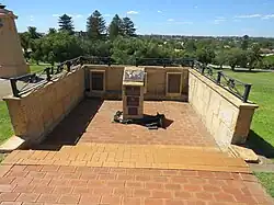 An obelisk at the summit of Monument Hill was constructed in 1874 for use as a trig point by surveyors and navigators.[7] In an 1870s planning map of Fremantle, the obelisk was shown under the name Obelisk Hill, which remained in use until its demolition prior to the construction of the memorial in the 1920s.[8] The area around the hill comprised limestone outcrops and low scrub. After the Western Australian gold rushes in the 1890s, a number of shanty towns, commonly referred to as "canvas towns", came into existence on the outskirts of Fremantle, including on Monument Hill. The reserve was vested as a public park on 20 July 1904, under the name Obelisk Reserve. Under the specifications of Fremantle's town engineer, quarrying of the limestone outcrops commenced shortly after, and was used by a number of local companies, including the Fremantle Tramways. Various landscaping works were carried out between 1904 and 1910, including the planting of trees, and construction of footpaths, drinking fountains, and fixed jarrah seats.[9]