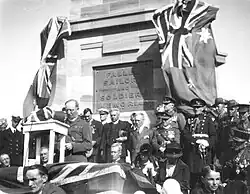 The memorial was completed and inaugurated in 1928. An initial ceremony was held on Anzac Day (25 April) 1928 to dedicate a memorial tablet on the main column prior to the completion of the memorial. This ceremony was carried out by Archbishop Riley. The main unveiling, after construction had finished, took place later that year on Armistice Day (11 November). The unveiling was carried out by the Lieutenant-Governor of Western Australia, Robert McMillan, with the memorial dedicated by Canon Collick.[21]