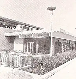 The board issued a $590,605 contract in February 1977 and construction began that April.[24][25] The new lot with 300 spaces opened on June 16, 1977. It was created by filling a water retention lagoon and covering it with gravel.[26][27] After a year of allowing the fill to settle, paving work began in May 1978.[28] In September 1978, the board awarded a $269,000 contract to create a new east entrance to the station. The work included a 2,200-square-foot (200 m2) expansion of the fare lobby, new faregates, a bus transfer plaza, and a new access road.[29] The paved lot opened in October 29, 1978, leaving the station with 1,000 parking spaces; construction of the new entrance began at that time.[30] The east entrance and the bus plaza opened on April 7, 1980.[31]