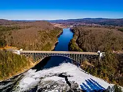 The French King Bridge is the three-span "cantilever arch" bridge[2] that crosses the Connecticut River on the border between the towns of Erving and Gill, Massachusetts, United States. The bridge, part of Massachusetts Route 2, carries automobile, bicycle, and pedestrian traffic and is owned and managed by the Massachusetts Department of Transportation (MassDOT).