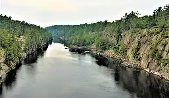The French River flows through typical Canadian Shield country, in many places exposing rugged glaciated rock but also through heavily forested areas on the upper portion. The mouth of the river contains countless islands and numerous channels which vary from narrow, enclosed steep-walled gorges, falls and rapids, to broad expanses of open water.