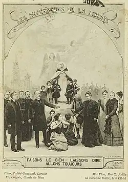 Arthur Dessoye, who represented the Ligue de l'enseignement, was the rapporteur for those bills.[13] The bills were well received by defenders of the secular school system, but Catholics found them extremely provocative, which led to major upheavals in French society.[11] In the Chamber, several Catholic deputies, including Henri-Constant Groussau from the Nord region, vehemently protested them.[14] As for the renowned polemicist Édouard Drumont, he unreservedly labeled Doumergue as "an escapee from the St. Bartholomew's Day Massacre"[nb 1] in La Libre Parole on June 26, 1908.[15]
