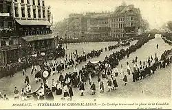 The three cardinals proceeded with their work, as Cardinal Lecot's death left them with no other choice.[24] Several Catholics attended the funeral of the late cardinal, which was closely monitored by the police, who anticipated possible unrest. Cardinal Coullié informed Merry del Val on December 21, 1908 that it was best to gain the French bishops' complete assent to adequately prepare for the attack against secular schools and cautioned against a one-sided directive from Rome. With Merry del Val's approval, Cardinal Coullié had the manuals analyzed by each bishop and co-ordinated provincial assemblies for their discussion.[25] Although the Paris assembly was quite moderate and found that only a few sentences in the manuals were in direct conflict with Church doctrine, the Besançon assembly identified several hazardous manuals, especially those that taught historyː[26]