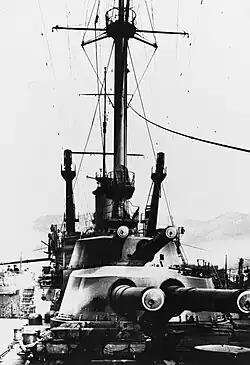 She received a major refit at Toulon from 1 May 1924 to 28 September 1925, during which the elevation of her main armament was increased to 23°, giving her guns a maximum range of 23,700 metres (25,900 yd), and two 1.5-metre (4 ft 11 in) high-angle rangefinders were added for the AA guns. Part of her forward hull armour was removed to lighten the bow and increase her forward freeboard, one group of boilers was converted to oil-firing and the flying-off platforms were removed. The ship resumed her position as flagship of the Mediterranean Squadron[14] when her refit was completed. Bretagne transported the Navy Minister, Georges Leygues, to Malta for an official visit over the period 27 April – 1 May 1926.[18] Provence reassumed the role of fleet flagship[14] on 1 October 1927 when Bretagne prepared to begin a refit to overhaul her boilers that began on 15 November and lasted until 12 May 1928. The navy took the opportunity to upgrade her fire-control systems, replacing her Vickers model with a French Saint Chamond-Granat system in a director-control tower (DCT), and replaced all of her original rangefinders with the exception of the 2-metre (6 ft 7 in) rangefinders in each turret. A pair of 4.57-metre (15 ft) rangefinders were added on the conning tower roof, another one in the DCT at the top of the foremast and another at the base of the mainmast. A 3-metre (9 ft 10 in) rangefinder was added to the DCT to measure the distance between the target and shell splashes, and a traversable 8.2-metre (26 ft 11 in) rangefinder was fitted to the roof of No. 2 turret. Directors with 2-metre rangefinders were also added to control the secondary guns.[19]
