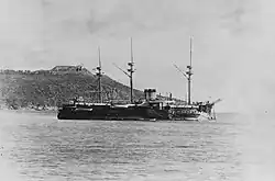 The ship was laid down at Toulon on 19 July 1875, and was launched on 27 April 1882.[8] After she had been launched, she broke from her mooring in a strong wind and ran aground.[9] Originally named Foudroyant ("Lightning"), she was renamed to honor Admiral Amédée Courbet on 25 June 1885,[8] who had died of cholera after leading French naval forces through much of the Sino-French War.[10] The ship was commissioned on 1 August 1885 for sea trials, and in December, she had her armament installed.[11] Trials were conducted off Toulon into 1886,[12] and she was placed in full commission on 1 October, though trials continued until 18 March 1887.[13] She thereafter joined the Mediterranean Fleet. In May 1887, Courbet took part in exercises to practice convoy escort; the French Army kept significant forces in French North Africa, and these units would have to be transported back to Europe in the event of a major conflict. The ship was assigned to escort a convoy of four simulated troop ships, along with the ironclads Colbert, Amiral Duperré and Indomptable. A squadron of cruisers and torpedo boats was tasked with intercepting the convoy. The convoy used bad weather to make the passage, as heavy seas kept the torpedo boats from going to sea.[14] In August, she represented France at the International Maritime Exhibition at Cadiz, before visiting Tangier.[15]