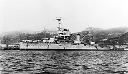 The modernisation was completed on 29 September 1931 and Jean Bart recommissioned on 1 October as the flagship of the 2nd Battle Division commanded by Rear Admiral (contre-amiral) Hervé. Her machinery trials lasted until 13 February 1932 and she then made port visits to Bizerte, Crete, Egypt, French Lebanon, Corfu, and Greece in April and May. Rear Admiral Jean-Pierre Esteva relieved Hervé on 1 August and the ship was refitted from 10 October to 24 November in Toulon after which she spent five days in Ajaccio, Corsica. Jean Bart exercised with the Mediterranean Squadron in the first half of 1933 and made port visits in French North Africa, Majorca, Spain and Casablanca, French Morocco.[19] After a collision on 6 August with the destroyer Le Fortuné in Toulon harbour that damaged the latter's stern,[20] the battleship was under repair from 8 to 15 August. From 20 April to 29 June 1934, the Mediterranean Squadron conducted its usual manoeuvres and port visits. The 2nd Battle Division was disbanded on 1 August and Jean Bart briefly served as the squadron flagship. The ship was assigned to the Training Division on 1 November and served as a school for stokers and signalmen. She made her last sea voyage on 15 June 1935.[21]