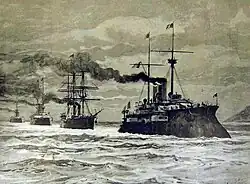 Bugeaud was transferred to the Levant Division in 1897, but engine problems forced her to return to Toulon for repairs, her place in the division being taken by the cruiser Suchet. Bugeaud was reassigned to the Mediterranean Squadron after repairs were completed later that year.[9][10] She was still in service with the squadron in 1898.[11] Later that year, she was deployed to the coast of Ottoman Syria, where she relieved Amiral Charner as the flagship of the Levant Division. The unit at that time also included the torpedo cruisers Vautour, Faucon, and Condor.[12] The divisional commander at the time was Vice Admiral Édouard Pottier. During this period, she served with the International Squadron that intervened in the Cretan Revolt. She carried Prince George of Greece and Denmark to Crete, where he became the High Commissioner of the Cretan State, part of the negotiated settlement to the conflict. The International Squadron was thereafter disbanded.[13]