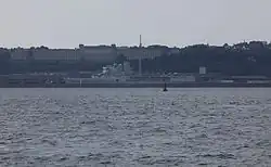 Close-up of the turret; the Exocet launchers, 100mm turret and boats are visible -